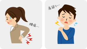 腰痛、頭痛、肩こり、背中の痛み、生理痛、五十肩、ぎっくり腰、坐骨神経痛、手・足のしびれ、股関節の痛み、膝の痛み、寝違え、むち打ち、肩の痛み、肘の痛み、スポーツ障害、妊娠中・産後の腰痛、骨盤矯正、ストレス解消、眼精疲労、お尻の痛み、自律神経失調、あごの痛み、疲労、免疫力向上、O脚X脚 など